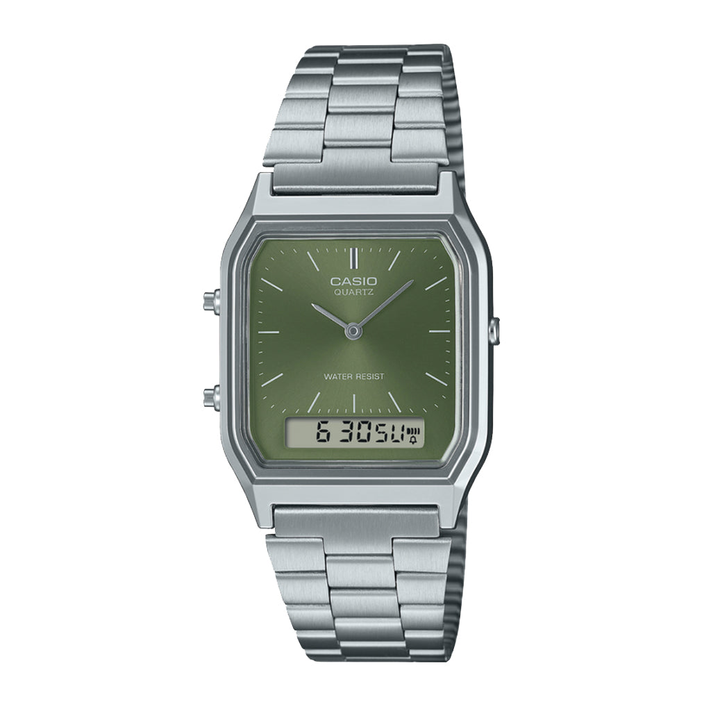 Reminiscent of the 1982 original Casio Janus AQ200, the Casio AQ230 series captures the same traditional style. Select models such as the AQ230A-3A sport a sunburst dial for an elegant twist on a time-honored design. While offering an analog-digital (ana-digi) dial, the Casio AQ230 series smartly ensures the analog hands on the hybrid dial never interfere with the digital LCD, giving you a clear read every time. The minimalistic design provides a simple read while capturing the vintage feel. Slim and exquisite at only 8.1mm thick, the Casio AQ230 series complements any attire. The thin profile will not interfere with sleeves or threaten to catch on an object. A chrome-plated bezel and resin case ensure both comfort and reliability, a hallmark of the Casio AQ230A-3A watch. At only 47 grams, this vintage silver watch exudes a wonderful presence without feeling heavy. The traditional design and sophisticated bezel and dial make the AQ230A-3A perfect for daily office wear, a night out, or casual use. Comfort and sophistication are the design mantras of the adjustable, three-clasp stainless steel band. The adjustable clasp makes it easy to find the perfect length and makes attachment and removal effortless. Relatively small links in the metal band allow for the band to more naturally conform to the curvature of your wrist, and the rounded outer edges prevent sharp contact with the skin. Traditional elegance and modern comfort are both found in the Casio AQ230. A vintage silver watch is only as good as it is reliable. The Casio AQ230 grants you peace of mind: water resistance protects the watch from accidental splashes, and the battery will last approximately 3 years. Although sporting a retro look, modern design principles are at play in the Casio AQ230 series. Reliability is a cornerstone of Casio quality, and the AQ230A-3A vintage silver watch is an example of Casio’s high standards.